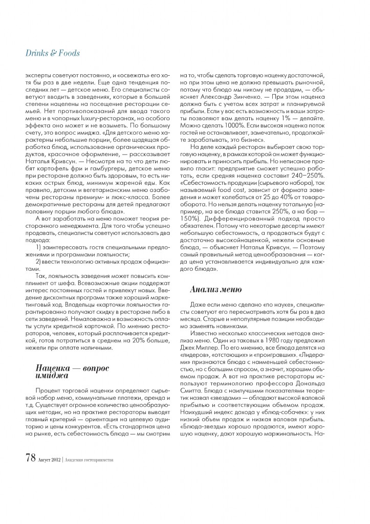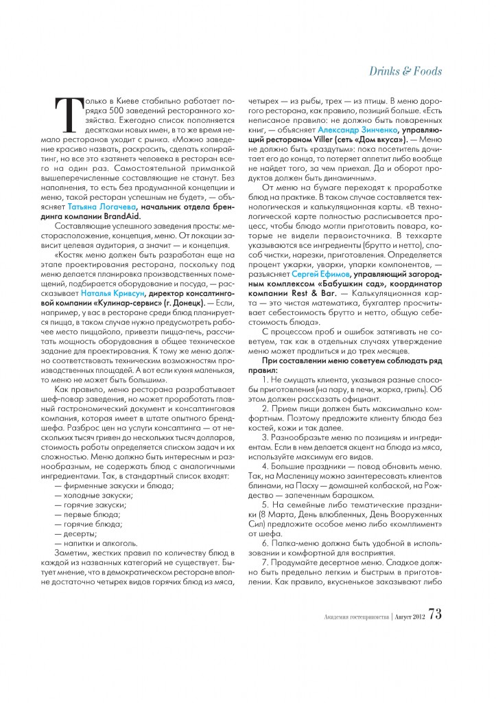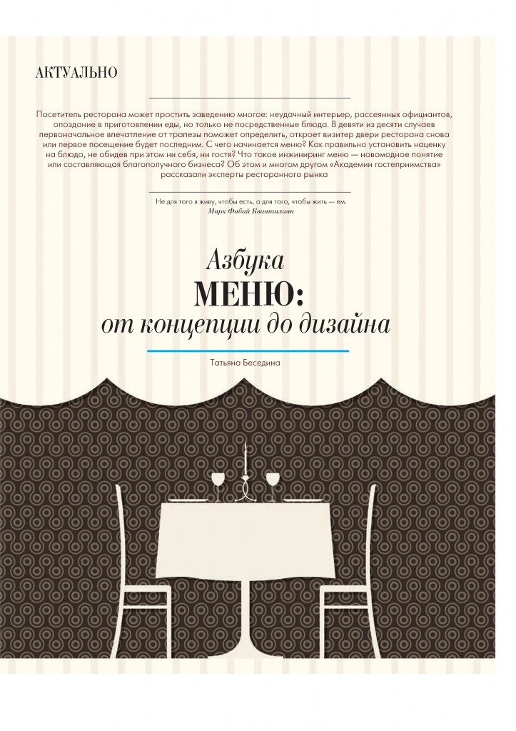 Посетитель ресторана может простить заведению многое: неудачный интерьер, рассеянных официантов, опоздание в приготовлении еды, но только не посредственные блюда. В девяти из десяти случаев первоначальное впечатление от трапезы поможет определить, откроет визитер двери ресторана снова или первое посещение будет последним. С чего начинается меню? Как открыть ресторан? Как правильно установить наценку на блюдо, не обидев при этом ни себя, ни гостя? Что такое инжиниринг меню — новомодное понятие или составляющая благополучного бизнеса? Почему специалисты сферы ресторанный консалтинг уделяют данному вопросу такое пристальное внимание? Об этом и многом другом «Академии гостеприимства» рассказали эксперты ресторанного рынка Не для того я живу, чтобы есть, а для того, чтобы жить — ем. Марк Фабий Квинтилиан