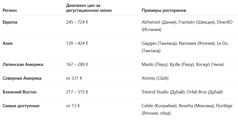 В целом стоимость дегустационных сетов в ресторанах из списка варьируется от демократичных 70 евро (обед в токийском Florilège) до нескольких сотен евро в заведениях Европы, США или Азии. Например: